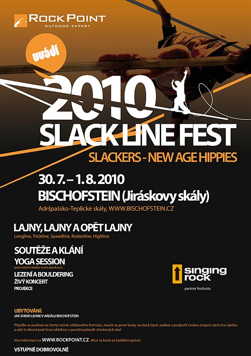 Přijďte se podívat na čtvrtý ročník oblíbeného festivalu, naučit se první kroky na slack lajně, potkat a podpořit českou (nejen) slack line špičku a užít si víkend pod širou oblohou v parádní přírodě...