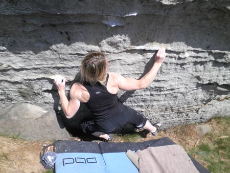 Boulder vám mohu popsat úplně přesně (taky jsem ho párkrát začernila), a že to ten den opravdu černilo! Jíťa je však milovnice vysokých teplot, a tak jí to nijak nerozhodilo, dvě sklopené lišty (ani jednu nevíte, jak pobrat, jednu dokonce berete s palcem a pak zase s palcem na spoďák) bravůrně podrtila a do závěrečného madla skočila. Paráda!
