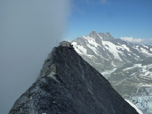 Ještě na Mittellegihutte na WC ta tyč na prošťouchnutí záchodu (tou dírou se tam lze dívat až dolů na nádraží jako dalekohledem)s nápisy OBEN a UNTEN na koncích, aby to někdo nespletl? Tak nějak si pamatuju, že hřeben nahoru je spíš turistika než lezení, ale sestup Z hřebenem je fakt hodně nepříjemnej...V každém případě expozice je úžasná.