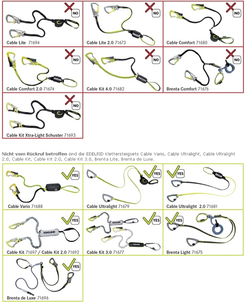 Německá firma EDELRID stahuje z trhu závadné sety na ferraty, poté, co bylo zjištěno, že po delším používání nemusejí sety splňovat bezpečnostní normy. Závady byly zjištěny na elastických popruzích setů.