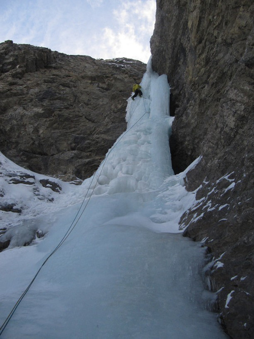 V Sunshine Valley kousek od Banffu je Bourgeau Left Hand WI 5 180 m, první dvě délky nabízí trošku tenčí led. Poslední délka může být někdy dost mokrá i v -10 C° a vše co na nás viselo tak parádně zmrzlo, pochopitelně i lana. Kolem Banffu je dost možností kam se vydat. Když zamíříte k Trophy Wallu, určitě nebudete litovat. Pro ty silnější lezce je The Terminator a Sea of Veapons 165 m, obě cesty v solidní klasifikaci kolem WI 6 a víc, zaleží na podmínkách. Přístup je sice dost dlouhý, skoro 2 hod, takže je potřeba si trochu přivstat. My tam lezli Professor Falls WI 4, 280 m led tam vydrží téměř až do května, někdo si cestu na jaře zpestřuje jízdou na kole. Celý led nabízí 7 délek, které nejsou nikterak náročné.