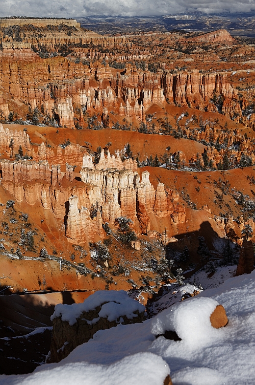 Další den přes kopce kolem 3000m prorážíme a kocháme v zavátým Bryce mezi poletujícíma vločkama. Kaňon je parádní les červených a žlutých skalních jehel uplácaných z hromad bláta, modrá obloha s roztrhanejma mrakama a bílý duchny na zemi.