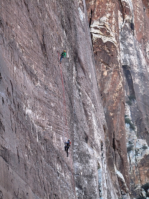 Při prvním setkání Red Rock působí jako obří červená korytnačka zasazená do pouštní krajiny, po bližším ohledání extrémně pevnej pískovec se spoustou pozitivních lišt v různých sklonech podle sektoru. Na začátku tápeme kam tady vlastně vyrazit, sportovní sektory co náhodně trefujeme jsou napřed srandovní, ale čím dál víc nás dostává rozmanitost místního lezení. Sportovky po lištách v různých sklonech, barvách i obtížnosti.