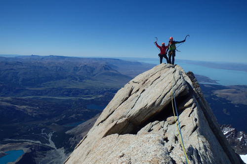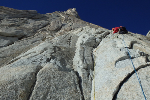 21.1. o 03:27 sa v trhline pod nástupom cesty Whillans-Cochrane 550 m, 70° M4, 5+ na Poincenot naväzujeme na lano. V sprievodcovi sa píše... This is a remarkably varied and scenic alpine route. The crux pitch is a short mixed section at the end of the ramp (50 m, 5  80°). From there easy rock (4 - 5+) leads to the summit. Tak sa riadime podľa sprievodcu, užívame si super počasie a podmienky, no a pred obedom sa na vrchole vytešujeme z našej prvej patagónskej cesty! Užívame si vrchol a neskutočnú scenériu okolo nás...  Poobede začína pofukovať, tak balíme fidlátka a valíme dole...