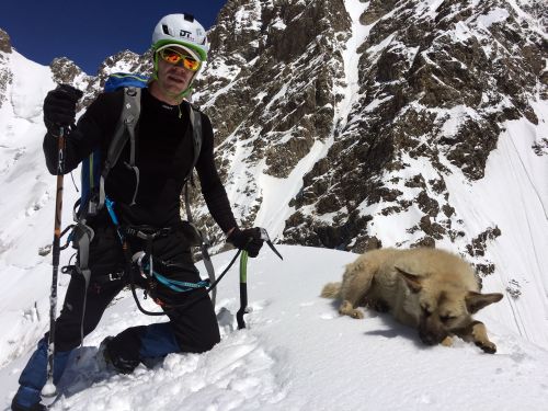 Další den ráno vyrážíme na aklimatizační výstup na Jižní vrchol (cesta č. 117 – 3A). Nezáporná noční teplota a denní teplota přesahující v BC South I třicet stupňů dělá ze sněhem pokryté hory loterii. Sněhová pole se už za rozednívání sypou a po pár hodinách doslova tečou pod nohama, seraky jezdí ve žlabech a po stěnách celého masivu neúnavně jak haranti na kopečku mezi paneláky, když v listopadu na sídlišti napadnou dva centimetry sněhu. Jižní vrchol (4350 m.n.m.) v úmorném vedru zdoláváme. Jako první je nahoře místní pes Myšák, který se k nám z neznámého důvodu přidal dole u Ukrajinského kempu a kterému jsme nedokázali vysvětlit, že bez sedáku, motyky a helmy je takový výlet riskantní. Na vrcholu okukujeme možnosti, jak by se přes sedlo dalo dostat na hřeben směřující k Západnímu vrcholu (5057 m.n.m.) a po chvíli už přes rozlámané skalní hřebeny a kašovitá sněhová pole utíkáme zpět do BC South I. Myšák s námi. Slaňovat jsme ho však neviděli.
