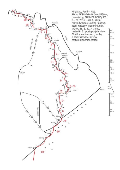Pik Alexandra Bloka 5239m Summer Bouquet 9+ (modrá linie)