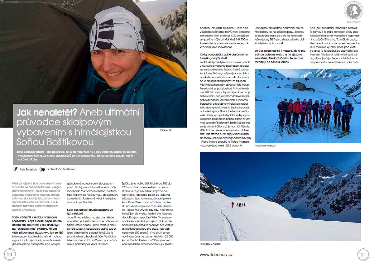 Spolupracovník lidé&HORY Petr Šimáček připravil pro lidé&HORY 6/2022 rozhovor s naší himálajistkou, držitelkou českého ženského výškového rekordu a majitelkou obchodu s outdoorovým vybavením Soňou Boštíkovou. V rozhovoru na stranách 20-24 najdete před začínající zimní sezónou mnoho užitečných informací o skialpovém vybavení.