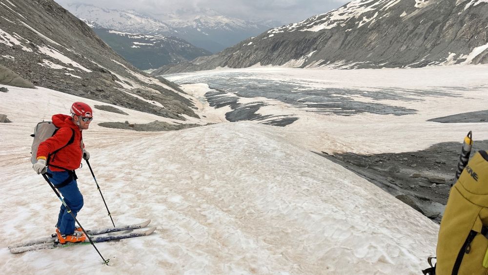 Cestou je třeba překonat velkou pláň, kde se dá slušně jít a km odsýpají. Pak přijde stoupání a nad tři tisíce ještě trochu přituhne. Přesto sklon není nijak dramatický. Předpověď však nelhala a čím výše, tím víc mraků a méně viditelnosti. Posledních cca tři – čtyři sta výškových metrů již vrchol není prakticky vidět a stoupáme v mraku. Rychlost větru již kolem 60 km/h, ale v tomhle terénu ani to není problém. Skidepo je těsně pod vrcholem a maček netřeba. Na vrcholu klasicky kříž, místo tak pro pět až deset lidí (potkali jsme se zde s kolegy Slováky, Poláky i Švýcary), za skalkou je i závětří. Moc se ale nezdržujeme, víme, že počasí se zhorší. Z vršku je sjezd trošku prudší, ale v podstatě v pohodě. Jakmile se dostáváme pod mraky, vidíme na všech stranách černo. Při přejíždění pláně vzpomínáme na Katku Neumannovou a Lukáše Bauera, protože ve změklém firnu střídáme soupaž s bruslením. Pak už sjíždíme zpět do špinavého sněhu a opět se vyhýbáme kamenům. Poslední kilometr jdeme zase pěšky. U kiosku dáme malé oslavné pivko, povyměňujeme fotky, chvilku pokecáme a jedeme dom. Druhý den v novinách čteme, co bouřková fronta nadělala ve Švýcarsku za paseku. Furka je zavřená. Přívalové záplavy, zbořené budovy, mosty, poničené silnice, dálnice a železnice, města odříznutá od zbytku světa …