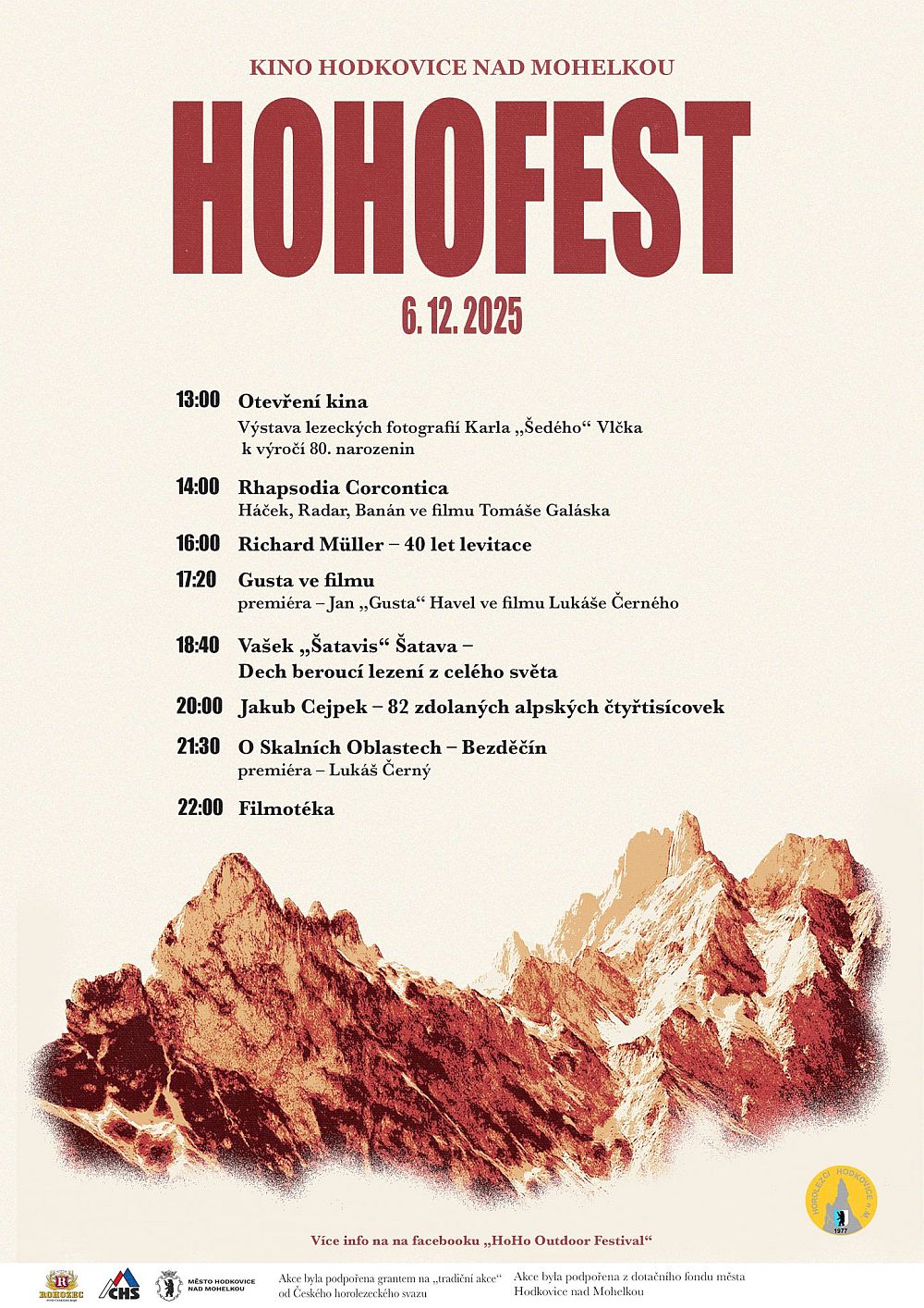 V sobotu 6. 12. 2025 od 13. hodiny začne další horolezecký festival v Hodkovicích nad Mohelkou. Po celý festival si můžete v klidu prohlížet fotografie Karla Vlčka. Ve filmech Lukáše Černého se projdeme po skalní oblasti Bezděčín a opět nahlédneme do života "Gusty" Jana Havla. Vašek Šatava zavzpomíná na úžasné lezení po celém světě, Jakub Cejpek nás naladí k výstupům na alpské čtyřtisícovky.