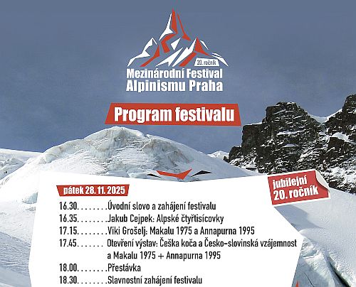Mezinárodní festival alpinismu Praha 2025 začíná dnes od 16:30 v hotelu International v Praze 6. Dnes je na programu přednáška Jakuba Cejpka, kterému se letos podařilo zkompletovat sbírku výstupů na 82 alpských čtyřtisícovek, či otevření výstav: Češka koča + Česko-slovinská vzájemnost a Makalu 1975 + Annapurna 1995. Zde přinášíme podrobnější program: