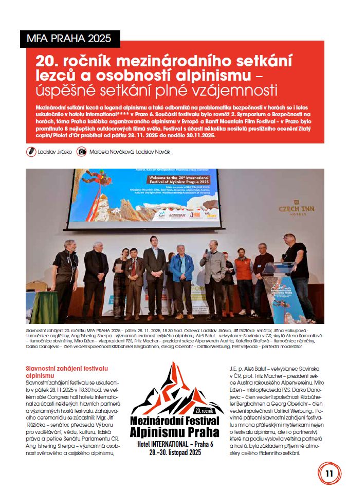Pětistránkovou informaci o průběhu úspěšného 20. ročníku mezinárodního setkání lezců a legend alpinismu a také odborníků na problematiku bezpečného pohybu v horách, které se ve dnech 28.-30. listopad 2025 uskutečnilo v hotelu International v Praze 6, najdete na str. 11-15. Jednou z nosných myšlenek festivalu byla role Prahy jako kolébky organizovaného alpinismu v Evropě – konec 19. století a Johann Stüdl a Karel Chodounský. Ve fotogalerii na str. 81-83 je mnoho zajímavých záběrů z tohoto velmi povedeného třídenního setkání.