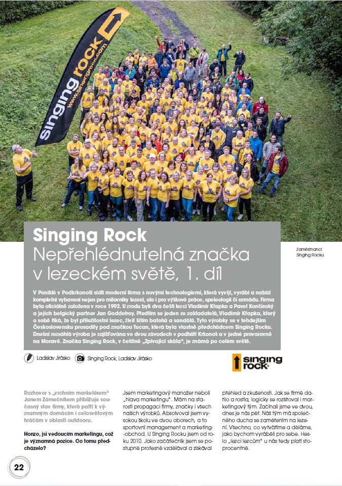 V Poniklé v Podkrkonoší sídlí moderní firma s novými technologiemi, která vyvíjí, vyrábí a dodává kompletní vybavení nejen pro milovníky lezení, ale i pro výškové práce, speleologii i armádu. Firma Singing Rock byla založena v roce 1992. Více se o firmě, která je známá po celém světě, dozvíte v rozhovoru s „hlavou marketingu“ Janem Zámečníkem na str. 22-27.