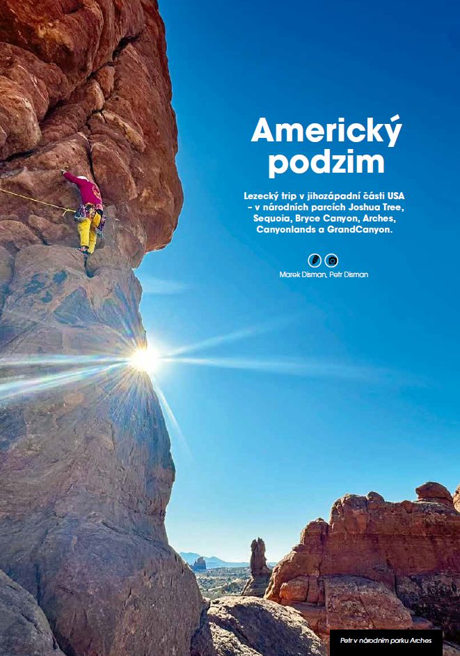 Na lezecký trip do jihozápadní části USA, do národních parků Joshua Tree, Sequoia, Bryce Canyon, Arches, Canyonlands a Grand Canyon, zvou čtenáře lidé&HORY bratři Marek a Petr Dismanovi. Dny plné zážitků, jedinečné skalní útvary a mnoho zajímavého přibližují všem čtenářům a zájemcům o lezení povedené velkoformátové fotografie na str. 69-78.