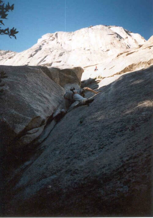 A pak si všimnu: asi jednu délku nade mnou ve stěně jsou dva lezci. Volám na ně, zda by mně nehodili fousa, že mám sedák. Mladí Amící to byli a že ne, že nemají čas, že to balí domů a tak. Přemlouvám je horem dolem, že jsem z Čech, že El Cap to je Mekka všech lezců světa, jsem tady služebně, jen na jedno odpoledne, že se sem už asi nikdy nepodívám a že mi to nemůžou udělat. Pak prý, jestli umím lézt, a to rychle. "Jo, jasně, to dovedu," zapřísahal jsem se. Tak se nakonec slitovali a hodili coura. Byla to sokolíková spára, ne moc těžká, 5.8 (Tak za 5 až 5+ UIAA) na žábu, ale musel jsem se snažit, abych lezl rychle a ve zbrklosti nespadl. No bylo to super, Michel fotil.