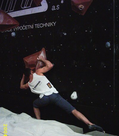 A byl! Kvalifikační bouldry se totiž nikomu ze zůčastněných nepodařilo dát na první pokus (za ten bylo dvacet bodů navrch) a jen Ondra Beneš si sáhl na všechny jejich topové chyty. V prvním bouldru si téměř všichni vylámali zuby na posledním (třetím :) kroku, kde bylo nutno ustát hladkou strukturu proti nevelkému bočáku. Druhý boulder byl spíše technický a jeho obtížnost spočívala v navalení se na nohu, držíce se při tom za hranu, a šáhnout si pro top v poklopené stěnce. Ve třetím bouldru končili téměř všichni na stejném míště -  a to místě bez chytů, kde pomohla snad jen veliká vůle a víra. Ti co jí něměli v tomto místě boj vzdávali, ostatních pár nadšenců se piď za pídí odtlakem soukalo výše a výše k nebi. Čtvrtý boulder vyžadoval od závodníků výjimečně spíše hrubou sílu než vyvinutou mozkovou kůru.