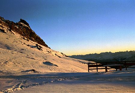Navazujeme se, mezi sebou necháváme pět metrů a mastíme dolů…no, mastíme…já spíš vrávorám, jak jsem vysílenej. Údolí pod námi se už dávno rozsvítila a my klopýtáme ve tmě v té obrovské expozici, kterou vrchol Glockneru nabízí. Naštěstí bylo dnes na vršku pár „normálkařů“, takže cesta je prošláplá a hlavně jsou vydupaný zmrzlý schody, po kterých se dá solidně sestupovat. Na Malém Glockneru se stmívá už úplně. Vytahujeme čelovky a hledáme železné tyče na slanění….támhle je jedna, jedu dolů jako první. Hrozně se motá lano. Trvá snad půl hodiny, než to rozuzluju, hrůza. Mám další tyč a Jarda jede za mnou. Hned pokračuje dál, tápeme, jestli teď jet rovně nebo doleva…všude to v tý tmě vypadá stejně. Jarda naštěstí nachází stopy a pokračuje nakonec doleva na další štand. Je mi strašná kosa… sjíždím k Jardovi. Vypadá to tak ještě na jedno slanění a jsme na ledovci. To už snad zmáknem. Stahujeme lano a ejhle…ani se nehne. Seklo se někde nahoře ve tmě. Dost dobře už nejsem schopen cokoliv dělat, jsem ouplně hotovej…snad to Jarda vycuká. Leze nahoru lano vysvobodit…za chvíli je zpátky u mě, stáhne dva metry a lano se zase rafne…takhle se to opakuje třikrát…Jarda pendluje dvacet metrů nahoru a dolů, já pomalu promrzám na štandu, snažím se trochu zahřát pohybem, ale už to není nic platný, chce se mi spát…Snad po hodině Jarda lano stahuje a připravujeme snad poslední slanění. Postupně sjíždíme na ledovec, motáme špagáty a sestupujeme na Adlersruhe…snad se tam dám nějak do kupy. U chaty jsme za chvilku. Jsem v notně zuboženém stavu, sotva motám nohama…mám dost! Jarouš je na tom líp, tak se o mě když tak postará…že jo! Schováváme se do závětří za chatu, pořádně se oblékáme a dopíjíme poslední zbytky čaje. Lehce přebalujeme bágly a valíme dolů na ledovec. Čeká nás ještě tak dvouhodinový pochod. Trochu jsem se zaplaťpánbůh srovnal, takže jsme na ledovci coby dup. Tam už se ale zase sotva vleču, odpočíváme snad každých sto metrů. Nemůžu popadnout dech, nohy už taky nechtějí sloužit…ještě tak kiláček a musíme být na chatě…je to nekonečný…sto metrů…zastavit, rozdejchat…zase sto metrů…už je tušit silueta chaty…ještě kousek a podáváme si s Jardou ruku podruhé...tak jsme to zmákli. Po čtrnácti hodinách jsme zpátky, byl to dlouhej den.