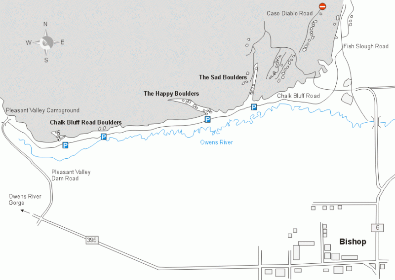 Jednotlivé oblasti jsou roztroušeny v okolí města Bishop do 20 kilometrů. Jedná se o mnoho menších boulder oblastí, avšak každá z nich je opravdu unikátní a v krásné přírodě. Nedaleko je i skalní velká a zvláštní oblast Owens river gorge (400 cest).