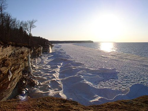 Ale zpet k lezeni. V zasade se lezeni okolo Munisingu odehrava podel brehu Horniho jezera a  na brezich blizkeho ostrova. Pokud je jezero zamrzle je pristup k ledum velmi pohodlny, pokud ne, je to trochu problem. Vicemene musis vedet, kde ty ledy jsou, jinak jsi tu pro srandu kralikum. Mel jsem stesti, ze jsme lezli s mistnaky a tak jsem si i zalezl. Co se tyce ledu, jedna se o zamrzle vodopady padajici z piskovcovych utesu do jezera. Takze se ve valne vetsine k nastupum slanuje na strmy breh jezera. Je to docela simrajici pocit, kdyz slanujes na jednojato na 60 m lane pres hranu obrovskeho previsu, na jehoz vrchol se mas sanci dostat jen kdyz to zvladnes vylezt ten led. Jinak te ceka ( pokud neni jezero zamrzle) jumarovani volnym prostorem se zadkem primo nad rozbourenou vodu s teplotou okolo 2 st.C.