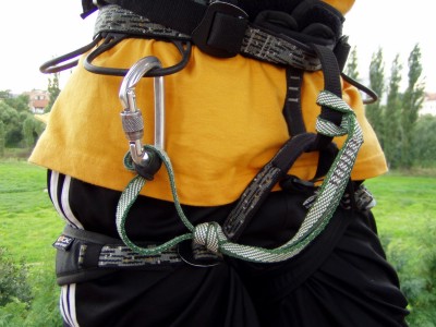 Jinak já mám širokej popruh na jednoducho, uzel u karabiny a druhej uzel u sedáku (mám tim zdvojený oko mezi pasem a nohavičkama)