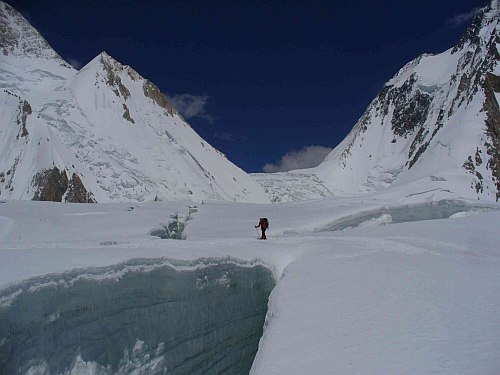 Na GI vystoupilo dne 12.7. asi 8 členů tibetsko – čínské expedice s 3 místními šerpy a několik hodin po nich i Joska Nežerka + Zdeněk + Olav. Ten den se již při horšícím počasí část naší expedice pokouší dostat Japonským kuloárem do tábora II (7000m), ale odpolední špatné počasí je donutí vrátit se zpět do sedla Gasherbrum La. Následuje perioda 5 dní nepřetržitého sněžení, které trávíme v ABC. Ještě to vypadá nadějně, času je stále dost. 18.7. jsme opět téměř všichni v sedle Gasherbrum La. Přes příznivou předpověď nás další den zdrží vítr, mraky a sníh přicházející sedlem z Číny. 20.7. vystupujeme Japonským kuloárem do tábora II (7000m). Vypadá to nadějně, předpověď je zatím spíše dobrá. Bohužel ve večerních hodinách dostáváme opravenou předpověď, vše se má na dlouhou dobu hodně zkazit. Od západu vidíme přicházet frontu, ale ještě doufáme, že bude pomalá. Nebyla. Již ve 2 v noci začíná poletovat první sníh, nad vrcholem se objevují mraky. V 6 už sněžení, mlha a silný vítr definitivně ukončují naše snahy. Zanedlouho se vracejí i 2 Ukrajinci a Venca, kteří to ráno ještě zkusili. Dopoledne pak za vydatného větru, sněžení a mlhy sestupujeme kuloárem se spoustou, naštěstí menších, lavin dolů do sedla a až do ABC. Další den až do BC. Jsme docela smutní, ale počasí nás nenechává na pochybách. Vítr a sníh dalších 5 dní vládnou horám a nedovolí ani dojít pro stany, co si tam nechala část Nežerkovi expedice.