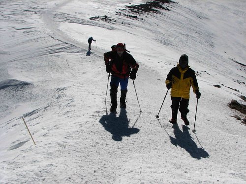 Padá mi trekovka a šourá se asi o 15m pode mě. Rozhodným krokem se pro ni rozejdu a vtom se mi trochu zatočí hlava. "Ha výška se ozvala - pomalu." Kolega mi tyčku přináší a já opět stoupám. Při odpočinku se projevuje únava a jde na mě spaní. "Tak to ne, vydýchat a jdeme". Po třech krocích se probouzím a zase to jde v pohodě. Mé problémy patří k těm menším. Vidím kolem jedince, kteří zvrací, někteří bezvládně leží a jiní to otáčí. Tady, ve výšce cca 5100m, se láme chleba. Konečně se po chvíli terén stává vodorovnějším, bohužel začíná dost foukat a mrzne mi pravé chodidlo a palce u rukou. Sedlo je stále ještě ve stínu. Můj duševní i fyzický stav bych nazval rovnovážným (bylo mi jedno jestli půjdu nahoru nebo dolů). Motivací však bylo slunce, které protínalo závěrečný svah zhruba v polovině. Z vrcholu vidím sestupovat ty nejrychlejší jedince, jeden tam byl dokonce i se psem.