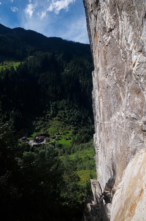 Sektory jsme měli předem vyhlédnuté od silnice, podrobnější průzkum však začal až nyní. První dvě navštívená místa v údolí Zillergrundu však nesplňovala naše představy (lámavá skála a malý potenciál, resp. 40ti metrová zatravněná plotna na nástupu k hlavnímu masivu) a tak přišla na řadu Olinova vzpomínka na „takovou vysokou stěnu nad tunelem, která je vidět od Bachhexe“.  Přejeli jsme do hlavního údolí a po projetí tunelem jsme už z parkoviště u hotelu dalekohledem zkoumali, kudykam. Po patnáctiminutovém výšlapu mokrou trávou a mezi nechápajícími krávami se před námi vyloupla 80m vysoká a převislá stěna. Cokoli říkat bylo v tuto chvíli zbytečné – přesně tohle jsme hledali a nakonec i našli!