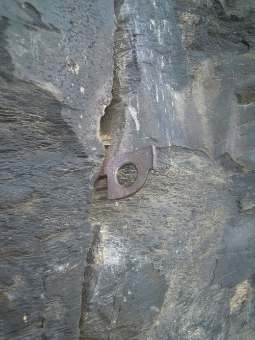 - Jištění je nutné použít vlastní, skoby (2) téměř nenajdete, ale snad jich tu prý bylo víc. Nástupy cest jsou označené obtížností, skála je čistá. Nad údolní hranou jsou dva nýty, případně se dá vyvázat strom.