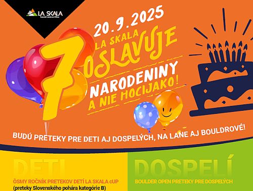 20.9.2024 oslavuje LA SKALA lezecké centrum SIEDME narodeniny. Pri tejto príležitosti už tradične pozývame všetky súťaživé deti na 8. ročník pretekov detí LA SKALA cUP v kategóriách U9, U11, U13, U15. Ide o kolo Slovenského pohára detí, preteky v disciplíne LEAD, kategória B. ... celý článek