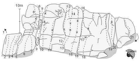 Projít obcí Ležky až k rozcestí (400m)doleva se nachází vrch s rozsáhlým buldřištěm (Ležky) a vpravo do kopce k nevysokým, ale pěkným skalám. První na ráně je Poslední skála - dolní a nad ní již téměř na vrcholu hřebene Poslední skála - horní. Je také možno zaparkovat hned na E6 a přímo k viditelným skalám. 10min ke Kapucínu.