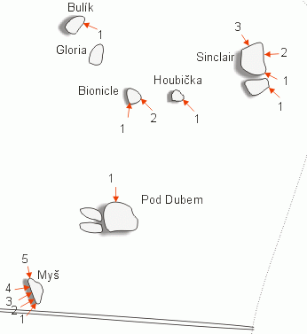 Nebo lesní cestou vpravo, těsně před koncem obce Nový Dvůr (dopravní značení) směrem na Rabštejn. Stále rovně podél hranice lesa (minete odbočku vlevo) a první odbočkou vpravo (stále stejně kvalitní lesní cesta). Bouldry jsou roztroušeny cca po 100m po pravé straně (kameny Myš a nepřehlédnutelný Pod Dubem).