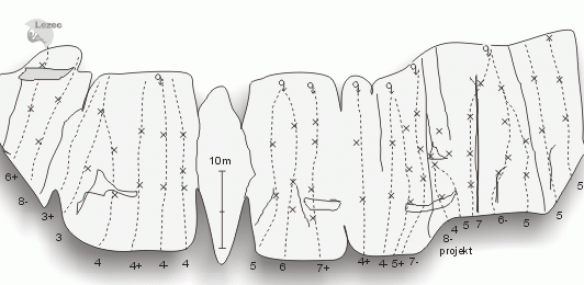 Cesty jsou vesměs kolmé s lokálními převisy, jsou kvalitně vynýtované, sem tam jištění může doplnit vklíněnec či friend. Lezení je spíše lehčí, jen přes převisy a hladkým místem vedou těžší linie. Lehké cesty bývají zamešené, zvláště v horních partiích.