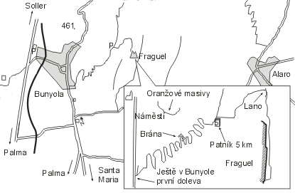 Klikatá šotolinová cesta, ktera odbočuje doleva do kopce ještě v městečku Bunyola, vas vyveze na vrchol kopce, kde zaparkujete, aby jste pak po krátkém sestupu úbočím, zalesněným polovysokými cesmínovými duby, došli do polorozevřeného kaňonu. Závěrečnou pasáž musíte již vyloženě sešplhat po zakotveném laně s uzlíky a ocitnete se v divokém užlabí, jehož obě strany jsou přerušovaně lemovány nádhernými oranžovými stěnami na jejichž vrcholcích se usídlily pokroucené borovice.(12-15 min. od auta)