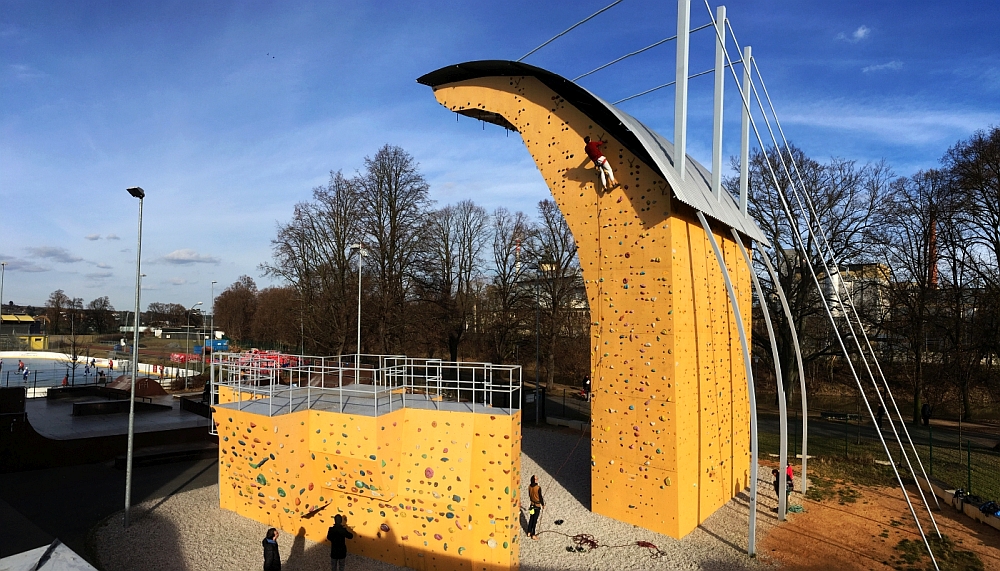 Konstrukce je kovová a plechový povrch profilů je kluzký. Maximální délka cest je uváděna až 17 m (v převisu), reálná výška stěny je kolem 12 m; běžně stačí 35m lano. V kolmých profilech si lezec cvaká vlastní expresky, v převisu jsou erární.